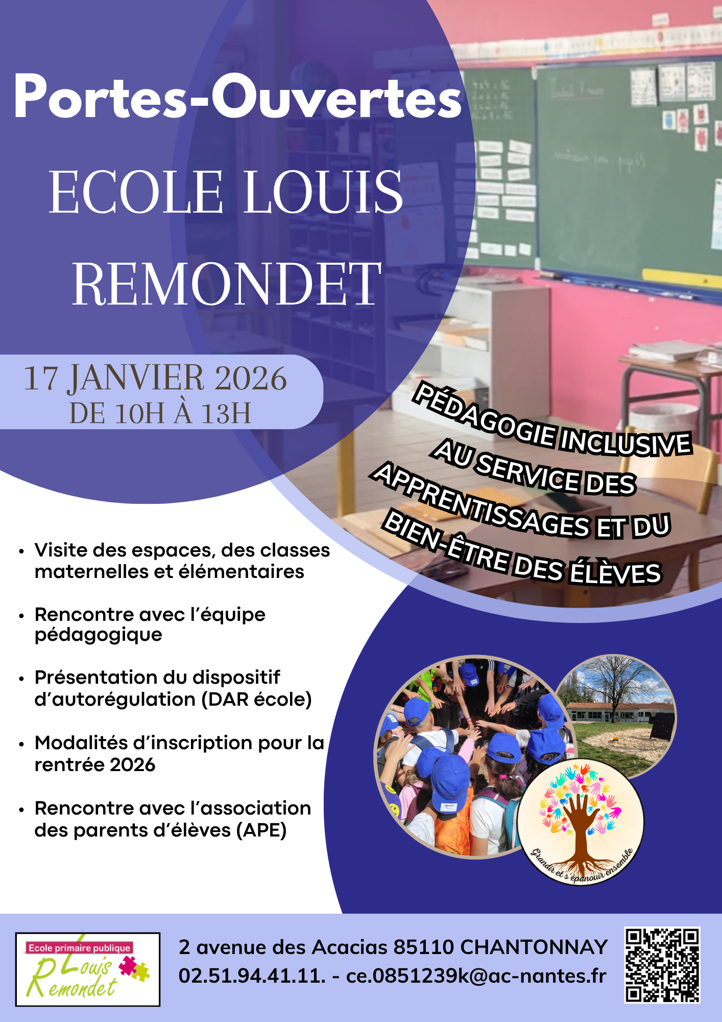 L’école primaire publique Louis Remondet ouvre grand ses portes et invite les familles, habitants de Chantonnay et des environs à venir découvrir son établissement, son projet éducatif et le dispositif d’autorégulation (DAR) accueillant les élèves avec troubles du spectre autistique depuis 2018.
